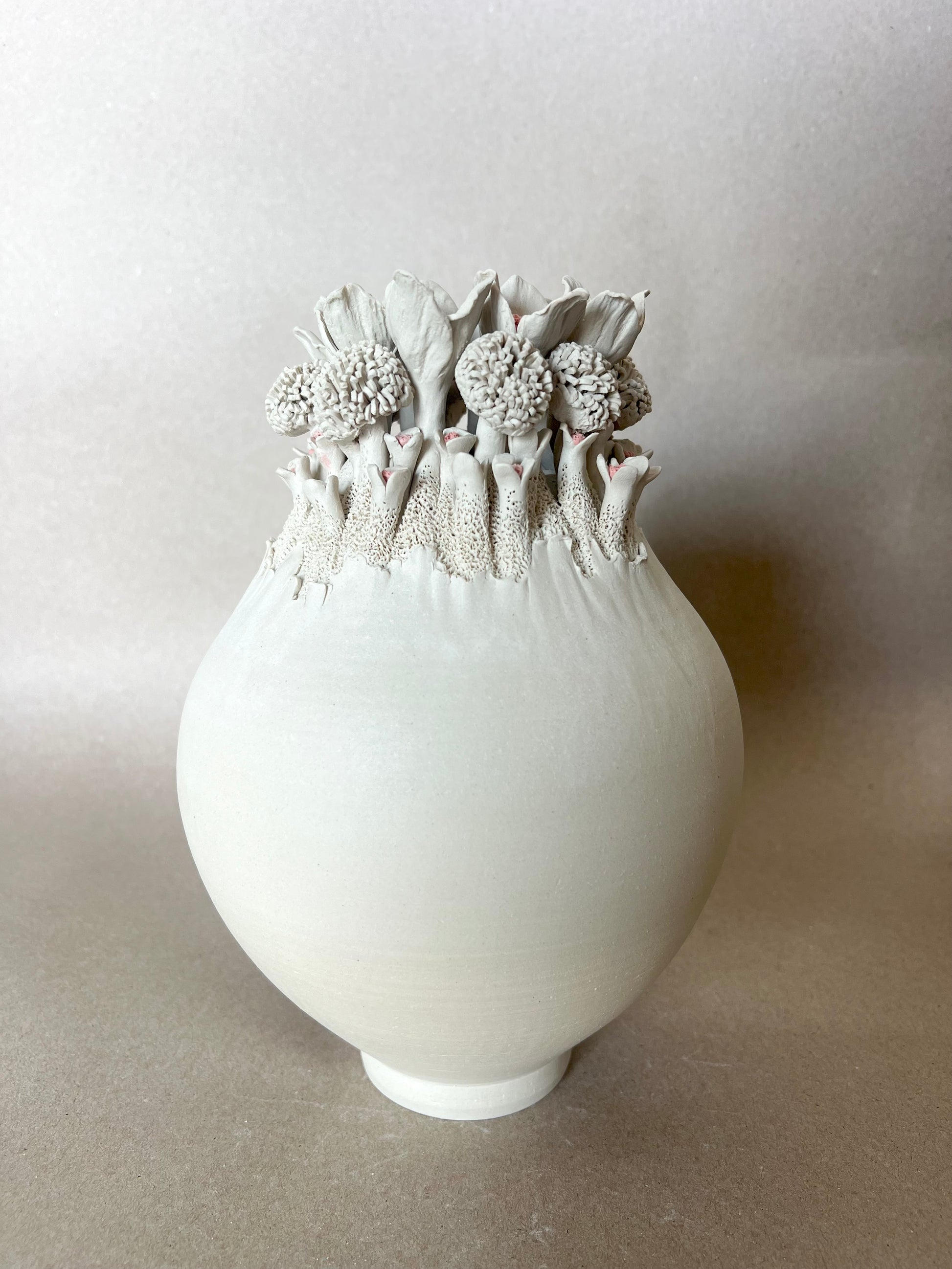 Wheel-thrown and hand-sculpted from stoneware, this 10-inch tall vase doubles as a sculptural statement, crowned with multiple delicate pink flowers emerging around its rim. The exterior is intentionally left raw, creating a tactile, earthy contrast to the smooth, glazed interior. A one-of-a-kind piece that celebrates nature’s abundant beauty while serving as both a functional vessel and a striking sculptural accent.