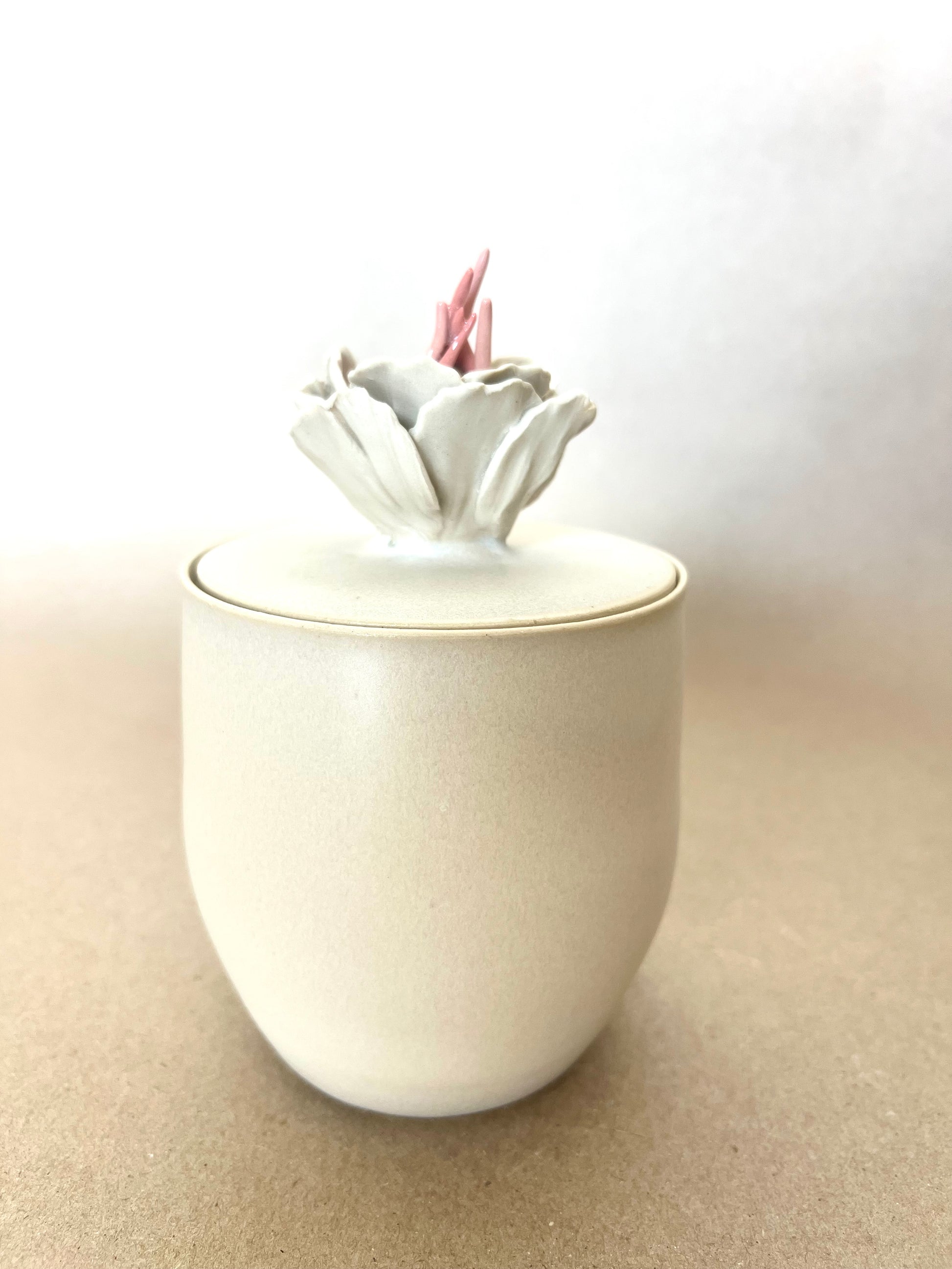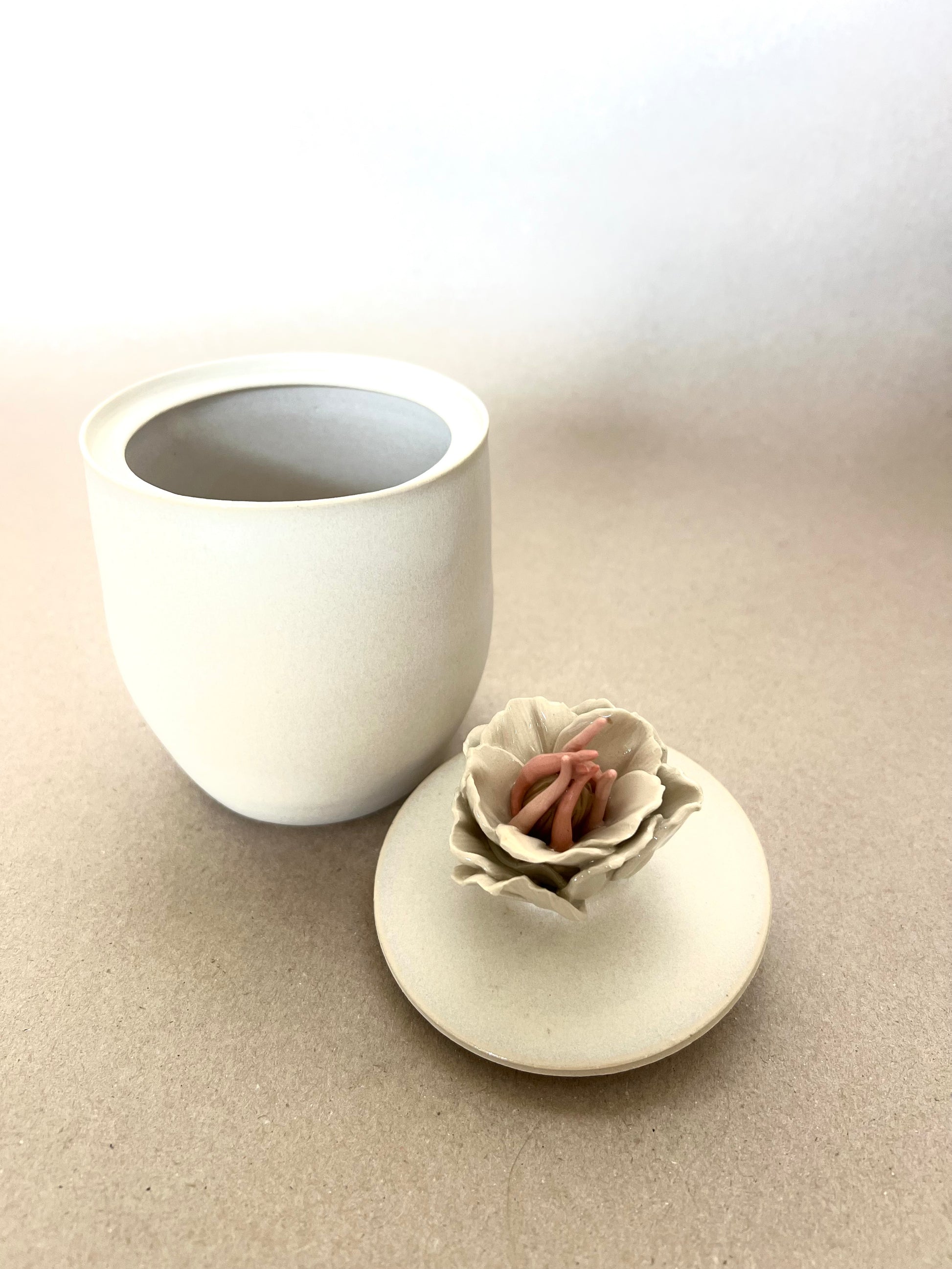 Wheel-thrown and glazed in a matte white finish, this lidded vessel is topped with a delicate flower featuring white petals and a soft pink center. The bloom serves as a charming handle, adding a gentle, sculptural accent to the minimalist form. Perfect for holding small treasures or as a serene decorative touch in any space.