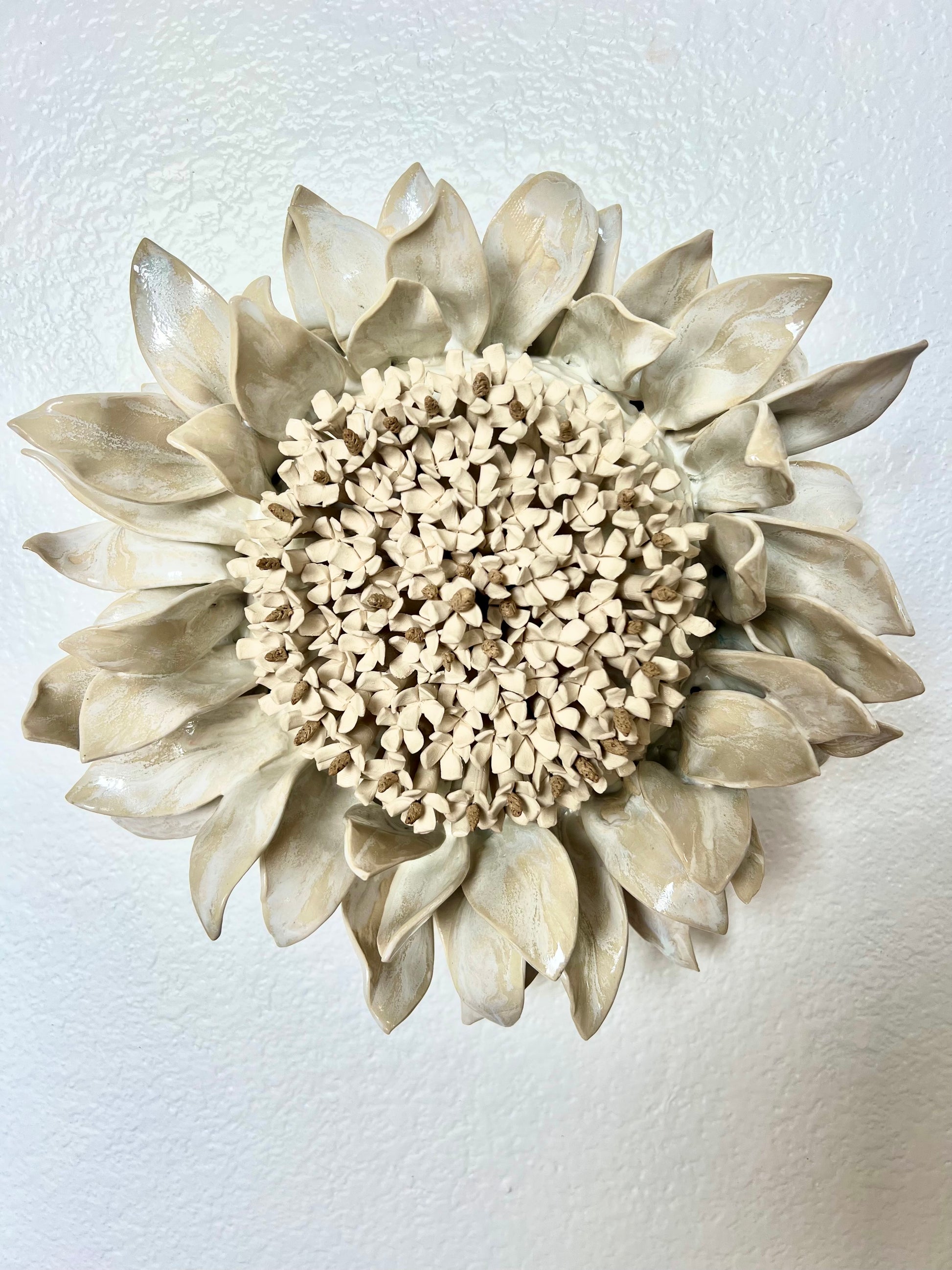 Thrown from stoneware clay and hand-built, this 13-inch wide, 5-inch tall sculptural flower merges the precision of the wheel with the organic grace of hand-shaped petals. Each bloom emerges as if caught mid-growth, a gentle reminder of the balance between structure and freedom. Designed to hang on the wall, it invites quiet reflection, celebrating nature’s resilience and the unfolding of beauty in every moment.